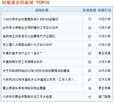 被转载最多的新闻排名:该指标帮助用户了解政府网站上发布的新闻哪儿些被转载报道的最多。